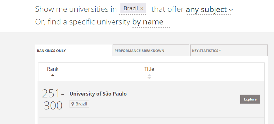 Como solitario representante del Perú solo aparece la Pontificia Universidad Católica del Perú (PUCP) en el puesto 25. Para tener una idea más clara de este ranking de universidades latinoamericanas respecto a las del ranking mundial, vamos a ver el puesto de la primera universidad latina: La Universidad de Sao Paulo.